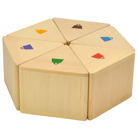 Dès 2 ans 12 pièces en bois brut en triangles, 1 sac de tissus. |