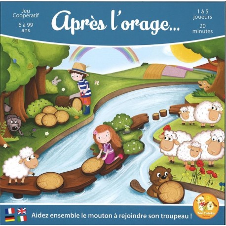 Dans ce jeu coopératif, vous jouez tous ensemble. Votre objectif commun est de réparer le pont et de faire traverser le mouton sur l’autre rive. Pour réparer le pont, vous allez poser des rondins... Mais encore faut-il les avoir sciés auparavant ! Méfiez-vous du castor qui vous chipe des rondins pour son barrage, au risque de ne plus en avoir assez pour réparer le pont. Avancez judicieusement le mouton par rapport à la réparation du pont et du déplacement du loup et du castor. Pour cela, à chaque lancer de dé, vous choisirez quel berger déplacer pour déclencher la meilleure action. Communiquez entre vous afin de bien coordonner ces actions pour réussir votre mission et éviter toute mésaventure. Une belle histoire à conclure, en équipe, avec des scénarios différents à chaque partie. |