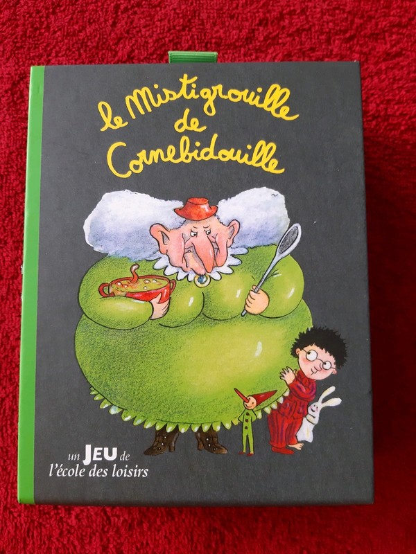 Distribuer toutes les cartes aux joueurs, chaque joueur doit constituer des paires. Si cêst le cas, il pose les cartes devant lui, face visible. Lorsque tous les joueurs ont posé leurs paires, chaque joueur à tour de rôle prononce un mot rimant avec "Cornebidouille". Dès qu'un joueur ne trouve pas ou répète un mot déjà dit, le joueur précédent commence la partie. Il tourne alors la roue et réalise la consigne indiquée par la flèche. but du jeu : Ne pas finir avec la carte Mistigrouille en main. |