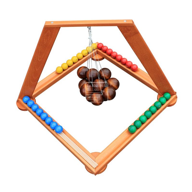 Dès 8 ans 1 structure en bois 32 boules ( 8 jaunes, 8 rouges, 8 vertes, 8 bleues ) 4 bâtonnets 1 règles du jeux |