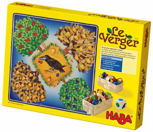 De 3 à 6 ans 10 pommes, 10 poires, 10 paires de cerises, 10 prunes, 4 paniers 1 puzzel représentant un corbeau (9 pièces) 1 dé avec couleurs et symboles 1 plateau de jeu 1 règle de jeu |