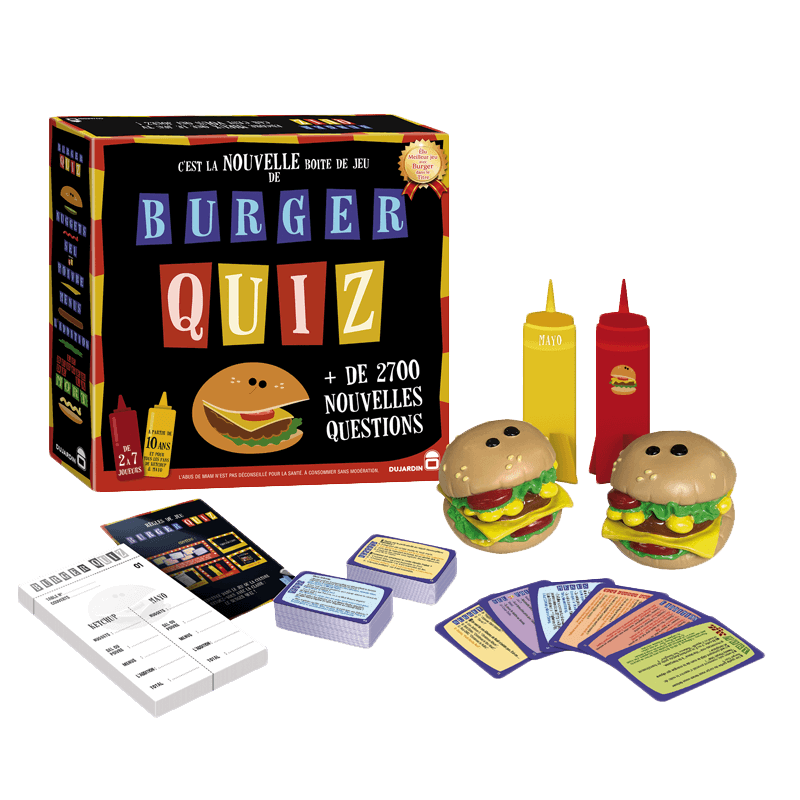 2 CheeseBuzzers 330 Cartes épreuves 1 Carnet de Commande Burger Quiz 2 Totems équipes Règle du Jeu |