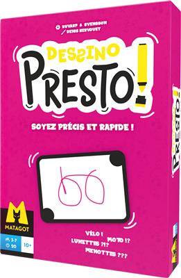 Dessino Presto est un jeu de société où les joueurs doivent dessiner le même mot au même moment. C'est une compétition de dessin où la vitesse peut battre l'habileté, donc tout le monde peut gagner ! Gagnez en étant le gribouilleur le plus rapide, mais attention - vous ne marquez des points que si la personne qui devine le mot peut réellement dire ce qu'est votre dessin ! Si vous êtes trop rapide, votre taureau peut facilement se transformer en fantôme ou en casque de viking. Les mots figurant sur les cartes sont soigneusement choisis, de sorte que le niveau de complexité est juste parfait (ni trop facile, ni trop difficile à dessiner), et que les joueurs choisiront probablement des approches différentes pour leurs dessins. |