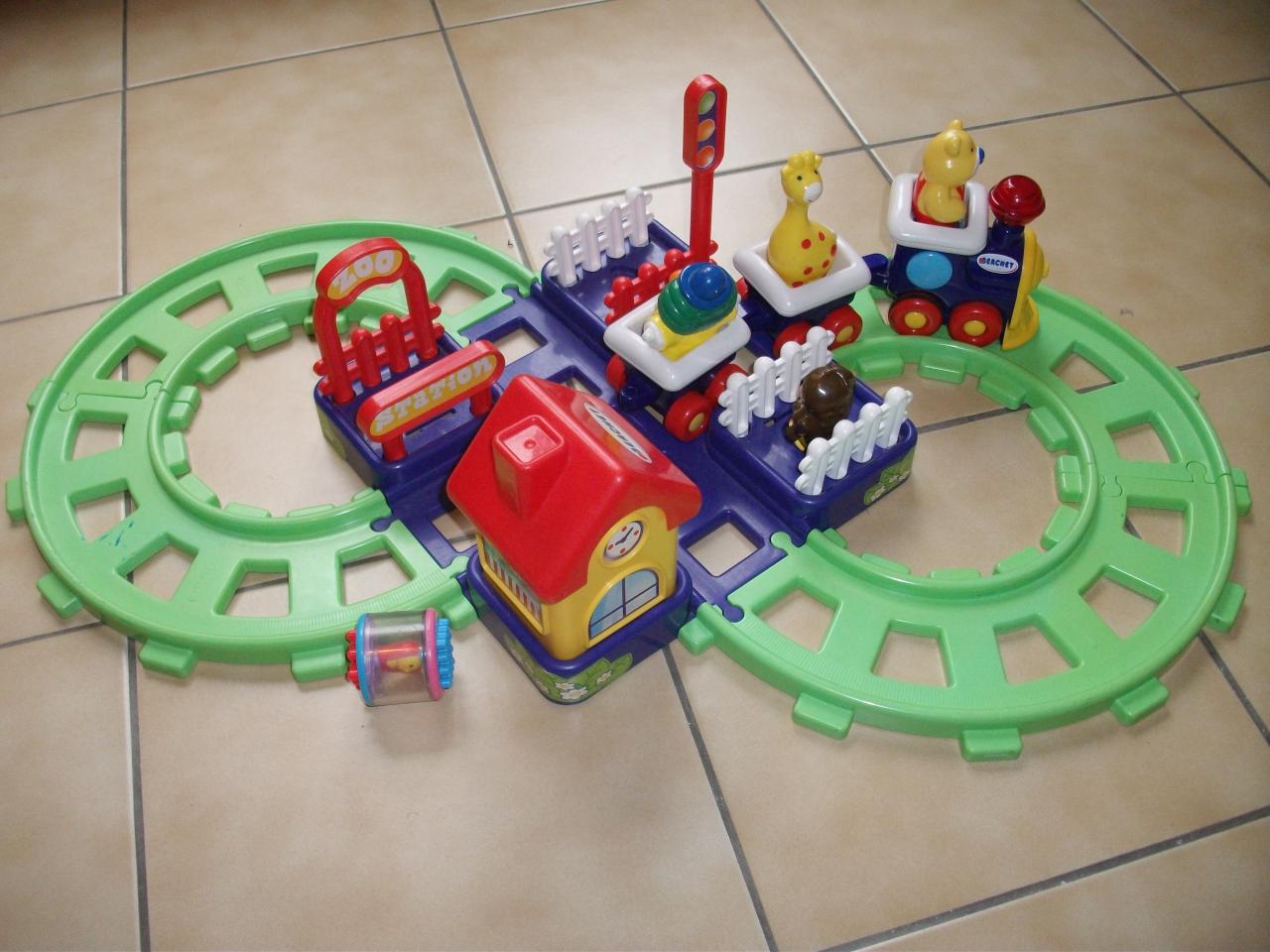 DES 2 ANS Dans caisse verte 1 base, 4 rails, 1 locomotive, 2 wagons, 6 barrières, 1 corps de maison 1 toit, 3 personnages |