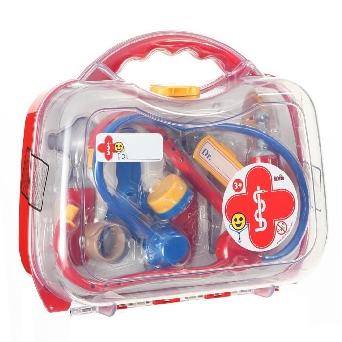 DES 3 ANS 1 malette, 9 pièces : 1 paire de lunette, 1 stétoscope, 1 seringue, 1 flacon, 1 paire de ciseaux, 1 natel, 1 thermomètre, 1 marteau réflexe,1 testeur oreilles,1 abaisse langue. |