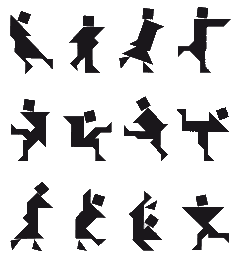Déroulement du jeu : Chaque joueur prend les 7 pièces de même couleur et les pose devant lui. Les cartes sont posées en tas au centre de la table, faces « solutions » cachées. NB : le nombre de cartes étant très grand, il n'est pas nécessaire de sortir toutes les cartes de la boîte à chaque partie. But du jeu : Effectuer des figures en utilisant les 7 formes de son tangram |