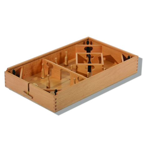 DES 4 ANS Une valise en bois avec couvercle, 2 toupies avec ficelle, 1 roi rouge, 4 chevaliers bruns, 8 archers, 1 notice |