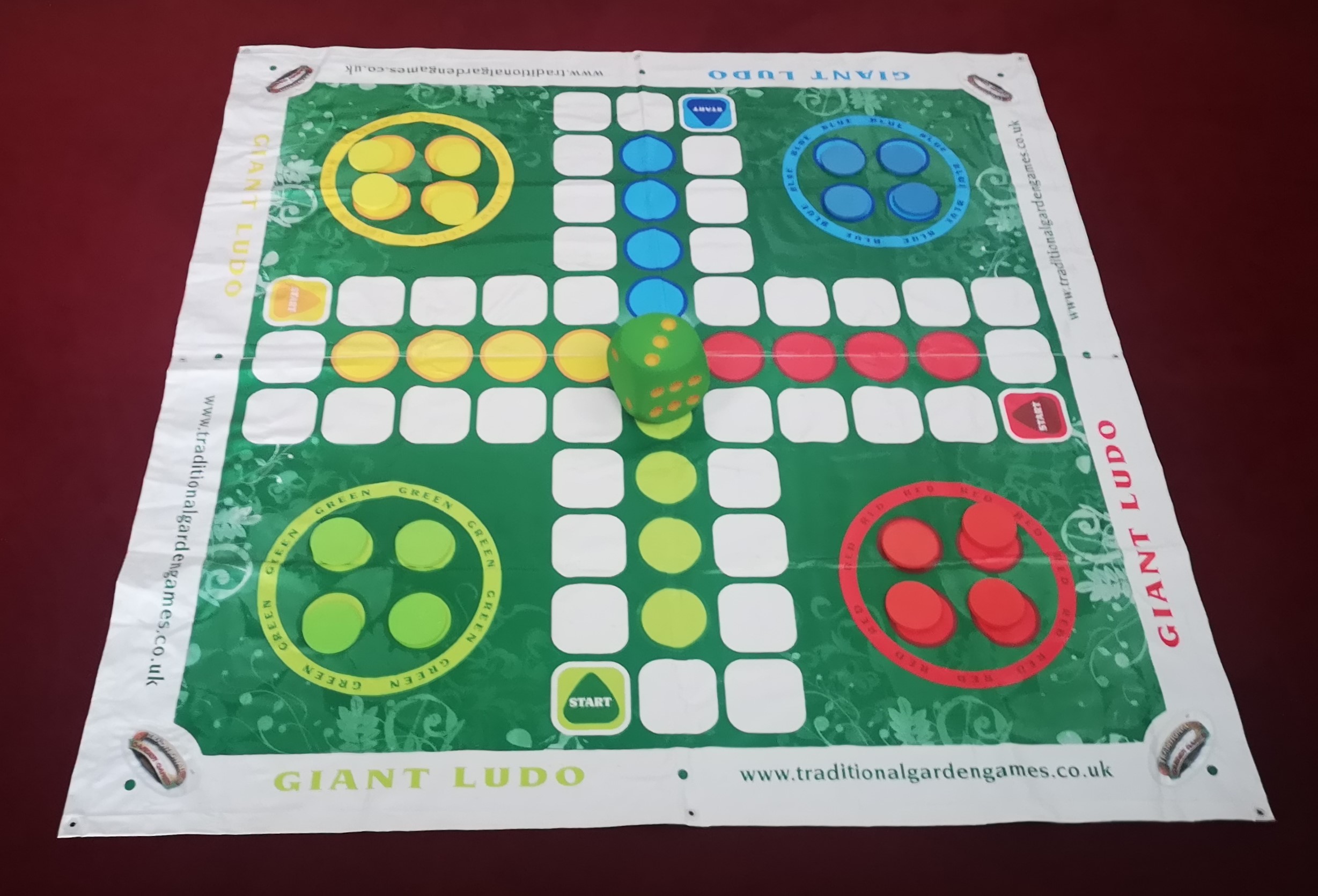 DES 6 ANS 1 plateau de jeu, 1 grand dé en mousse, 4 pions rouges, 4 pions jaunes, 4 pions verts, 4 pions bleus, 8 clous plastique noir, 1 sac, 1 notice. (pion-pallets en mousse) |