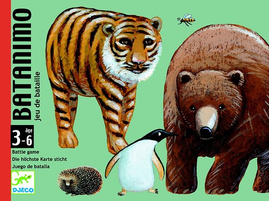 | Résumé : | Jeu de bataille et de mesure conçu pour les plus jeunes! Les joueurs retournent en même temps la première carte de leur paquet. Celui qui a mis la carte avec l'animal le plus grand remporte le pli. En cas d'égalité on dit "bataille", on cache 2 cartes puis on en retourne 2 autres pour déterminer le gagnant. Lorsqu'un des joueurs à remporter toutes les cartes, il a gagné la partie! Les plus jeunes peuvent jouer, même s'ils ne savent pas lire les chiffres, en se repérant à la taille des animaux! |