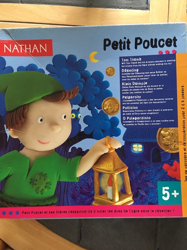 L'ogre s'est endormi au pied d'un arbre, le Petit Poucet et ses frères en profiteront-ils pour lui dérober tout son or ? A son tour, le joueur doit lancer un dé et avancer du nombre de cases indiquées, puis agir en fonction de la case sur laquelle il s'arrête : prendre des pièces d'or à l'ogre, passer son tour suivant etc... Mais attention, tomber sur la case cloche trop souvent réveillera l'ogre ! Les joueurs gagnent ensemble si ils récupèrent toutes les pièces de l'ogre avant qu'il ne se réveille. |
