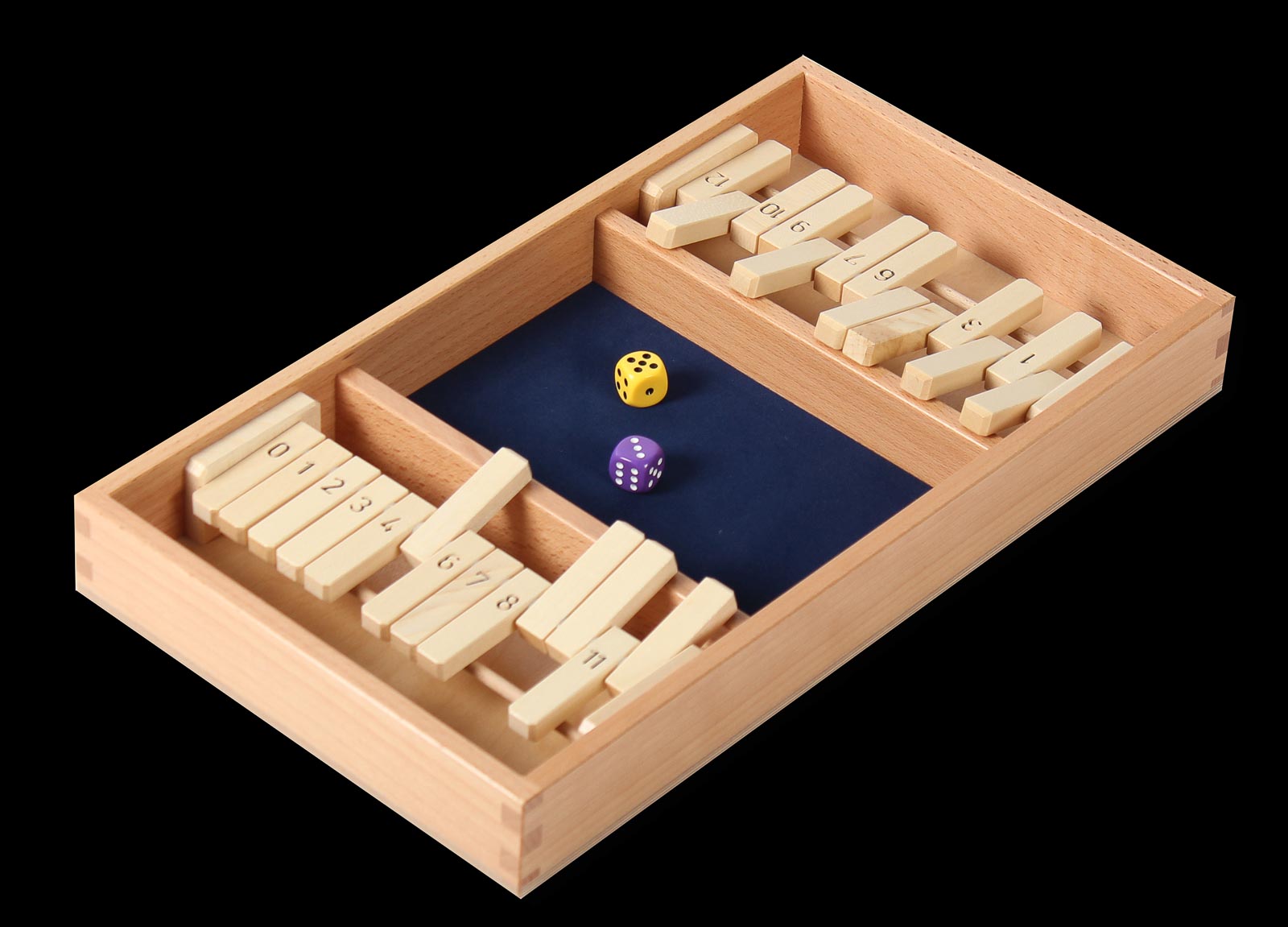 DES 7 ANS 1 boite de jeu en bois avec languettes, 2 dés (vert et orange), 1 notice. |