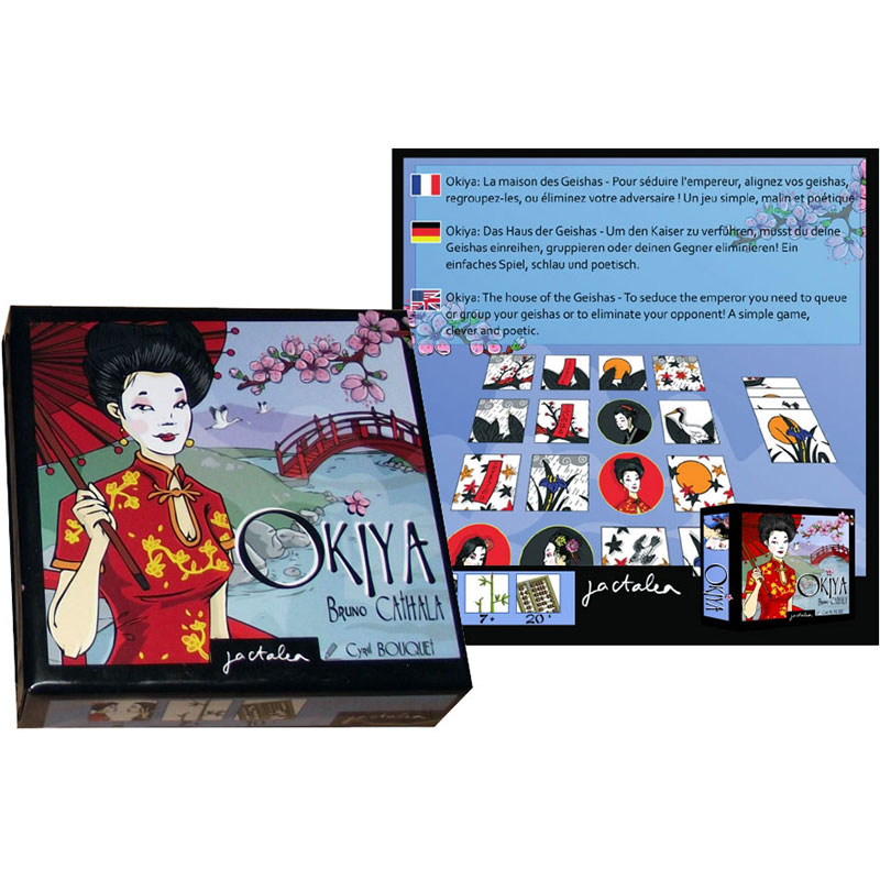 8 jetons Geisha pour joueur rouge 8 jetons Geisha pour joueur noir 16 tuiles jardin impérial dont : 4 séries de 4 tuiles. 1 notice. |