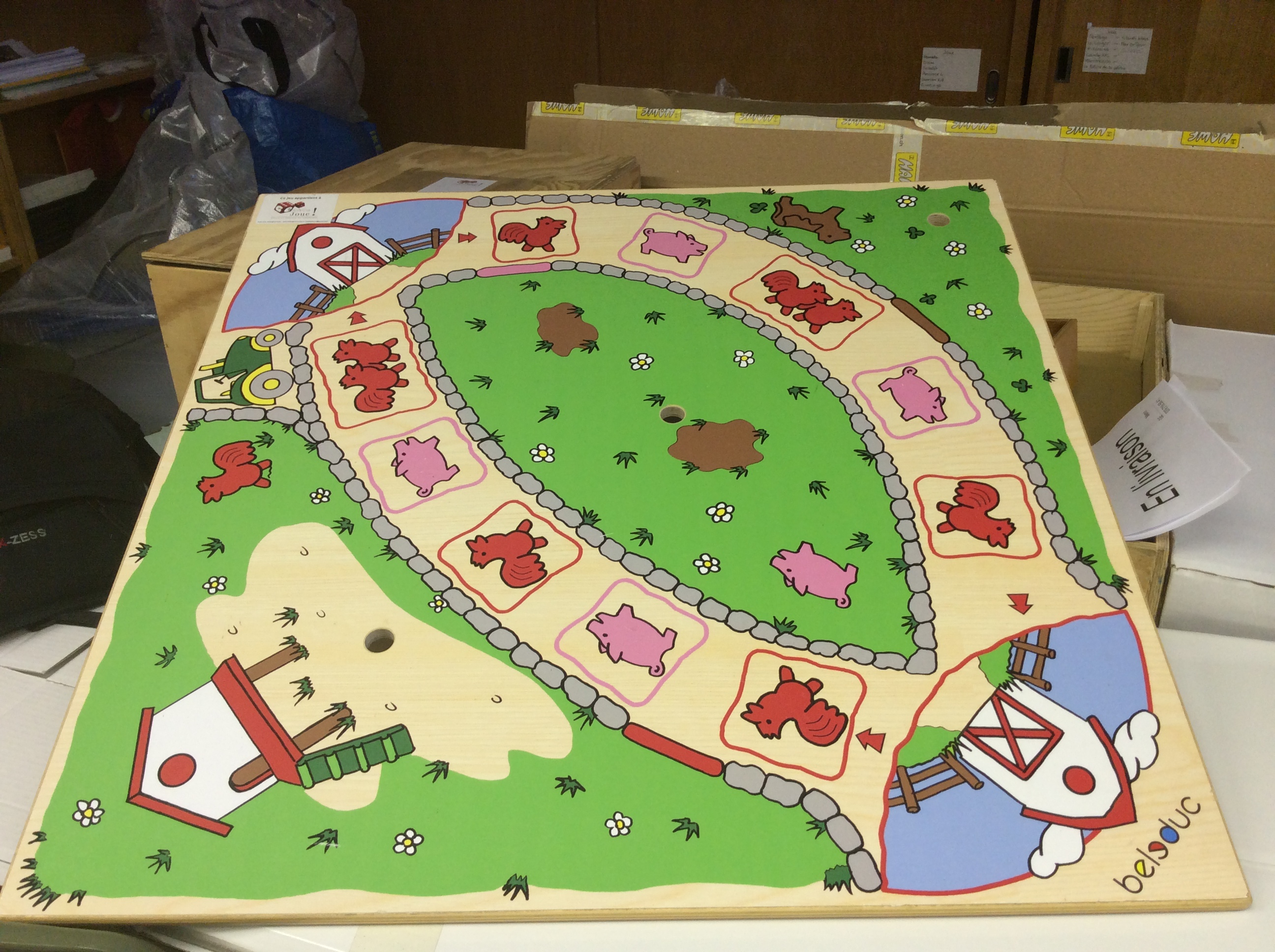 1 plateau de jeu géant, 4 figurines, 20 coqs, 15 cochons, 5 vaches, 1 tracteur, 3 panneaux, 1 dé, 1 sac, 1 carton, 1 notice |