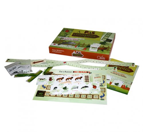 Dès 6 ans. Contenus: - 2 lignes de jeux - 2 pions - 2 dés classiques - 1 dé avec des faces de + et de – - 1 carte-flèche - 1 planche de jeu A4 recto/verso - 7 cartes « animaux chassés » - 3 cartes « renards chasseurs » et 3 jetons-piège - 1 carte-barrière - 4 socles - 4 bosquets, 1 notice |